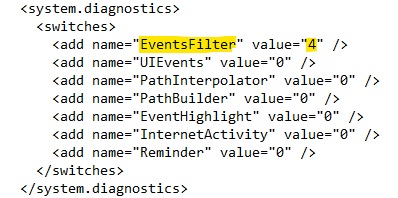 1.3. Edit the value of the relevent switch changing it from 0 to 4. For example this has set the value of the EventsFilter switch to 4: